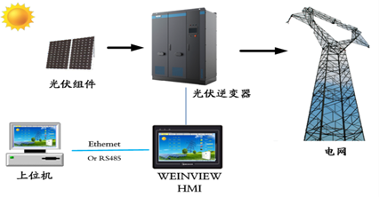 太陽能光伏并網逆變器是整個光伏發電系統中最為關鍵的設備之一,它是把太陽能電池板產生的直流電能轉換為交流電能的設備,運行過程中需要多個參數進行監測、計算、顯示、記錄、保存、報警等處理,需要和上位計算機、逆變控制器、無線GPRS模塊進行通訊,實現數據交換。本文主要講述WEINVIEW觸摸屏在太陽能光伏并網逆變器中的應用。