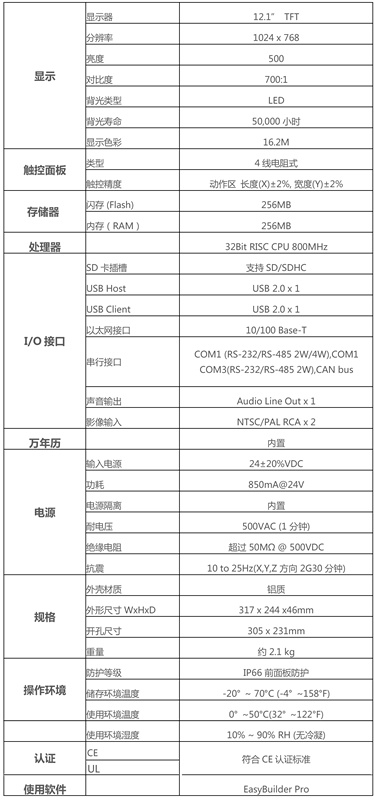 產(chǎn)品特點 Installation 鋁合金外殼搭配全新色彩與時尚設(shè)計 Video Input Ports 支持 NTSC 及 PAL 格式 12.1" 1024x768 TFT 工業(yè)級 LCD 無風(fēng)扇冷卻系統(tǒng) 內(nèi)置 256MB 儲存內(nèi)存及萬年歷 NEMA4/IP66 面板防護(hù)等級 陶瓷封裝高壽命LED背光 SD 卡插槽支持 SD/SDHC 內(nèi)置電源隔離防護(hù)器 Com1或Com3 RS485 2W 支持 MPI 187.5K CAN bus 裝置支持 CANopen 通訊協(xié)議 Com1 / Com3 RS485 及CAN bus 隔離器內(nèi)置